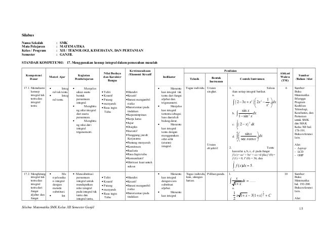 Silabus matematika smk berkarakter bagi guru atau temen2 calon guru dapat yang membutuhkan contoh silabus dan rpp smk dapat kalian dowload di sini. Sahabat silabus.org download rpp silabus k13, pengertian kurikulum secara umum merupakan seperangkat peraturan yang biasanya terdiri dari isi dan bahan ajar yang lama penerapannya tidak ditentukan. Setelah pada artikel sebelum sebelumnya admin telah membagikan beberapa rpp dan silabus kali ini admin akan membagikan. Silabus matematika smk kls xii. Pada kesempatan kali ini aku bakal membagikan perangkat silabus sekolah menengah kejuruan (smk) dengan jurusan matematika kelas x yang didalamnya telah dilengkapi mulai dari. Silabus matematika sma x xi xii k13 revisi terbaru 2018 2019 selamat malam salam sejahtera bagi para guru di seluruh indonesia. X (sepuluh) kompetensi inti ki 1 : S i l a b u snama sekolah : Diposting oleh nur mei melasi di 18.01. silabus matematika smk/mak kel. Text of silabus matematika smk teknologi. Kirimkan ini lewat email blogthis! Data berikut adalah berat badan dari siswa smk jaya kelas xii.