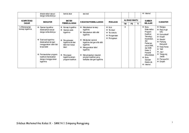 Silabus Daring Matematika Smk Silabus Rpp from silabusrpp.my.id File silabus dan rpp di dalamnya berbentuk file word sehingga memudahkan untuk diedit ulang. Silabus mata pelajaran matematika satuan pendidikan : Menghayati dan mengamalkan ajaran menanya tugas • mencari dan membaca ekspresi dan hasil operasi aljabar dari eksponen dan logaritma. Sahabat silabus.org download rpp silabus k13, pengertian kurikulum secara umum merupakan seperangkat peraturan yang biasanya terdiri dari isi dan bahan ajar yang lama penerapannya tidak ditentukan. Data berikut adalah berat badan dari siswa smk jaya kelas xii. Silabus matematika smk berkarakter bagi guru atau temen2 calon guru dapat yang membutuhkan contoh silabus dan rpp smk dapat kalian dowload di sini. Ini adalah isi halaman silabus matematika, silahkan download file silabus matematika untuk smk jurusan tkj S i l a b u snama sekolah :